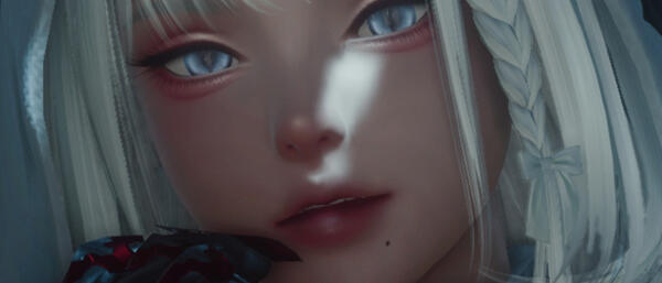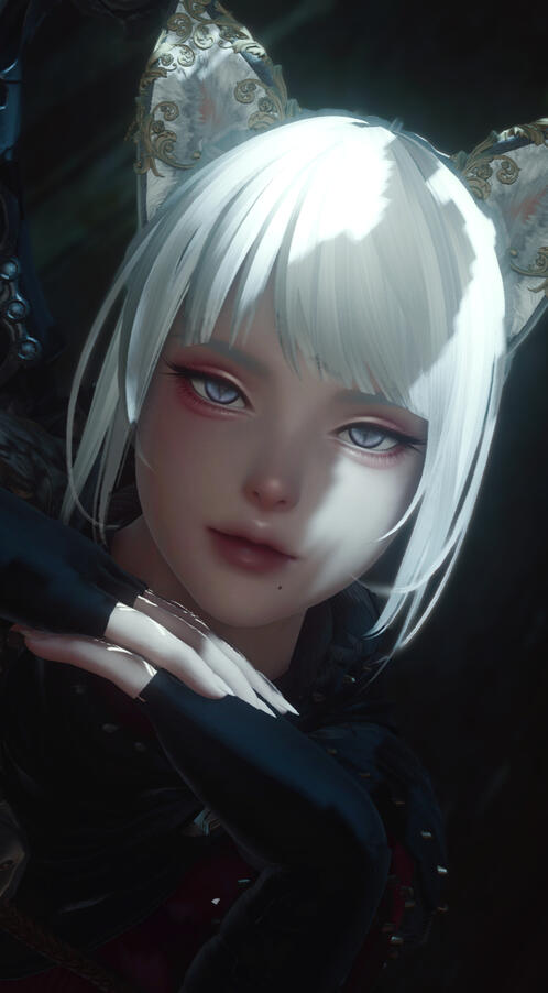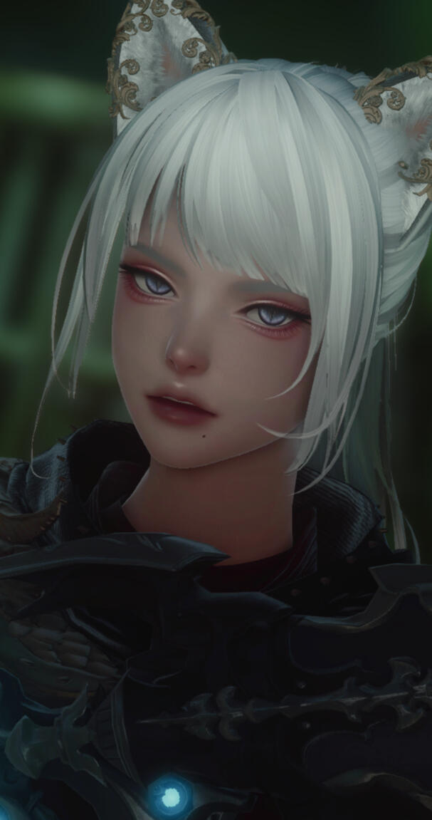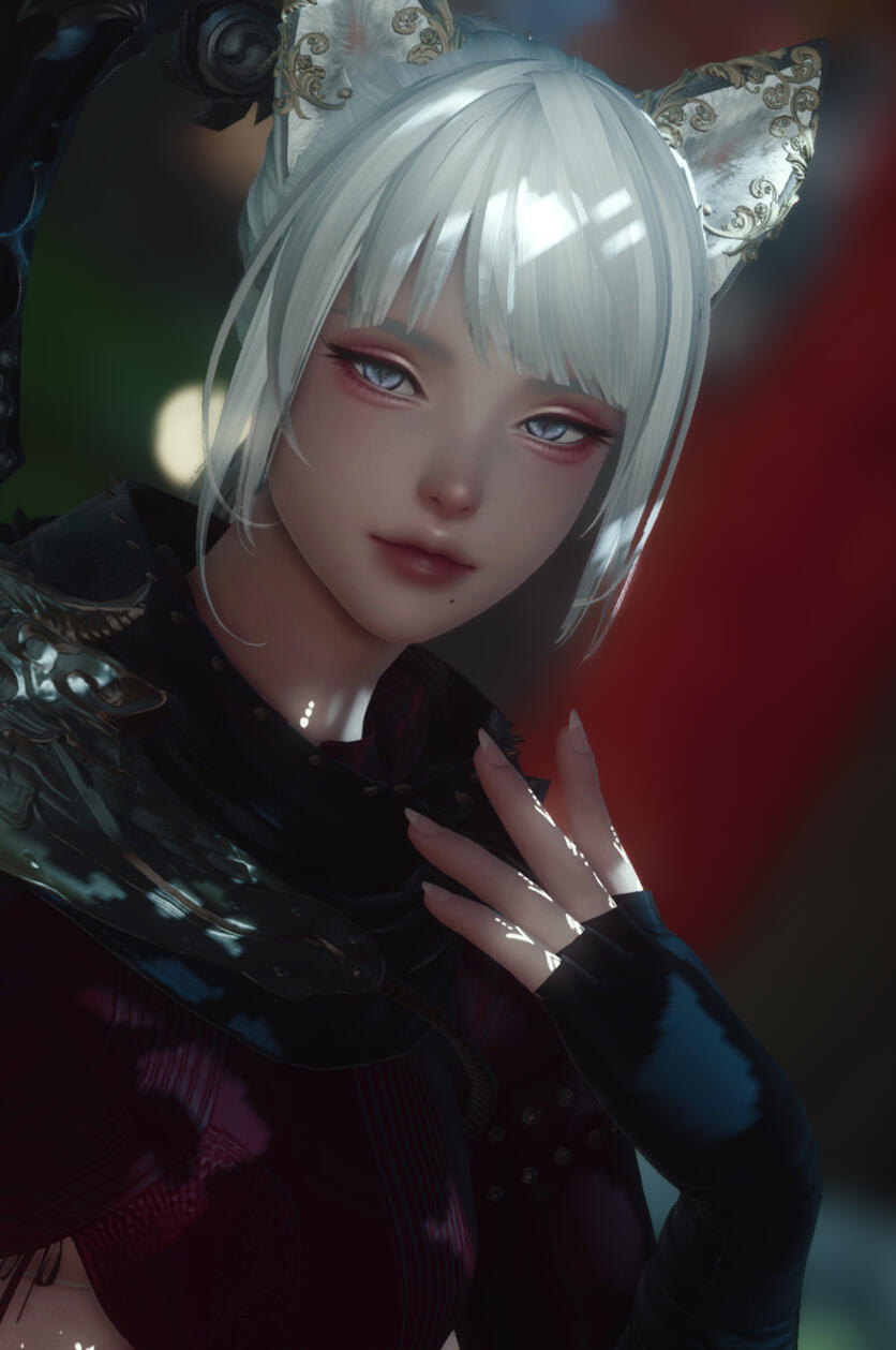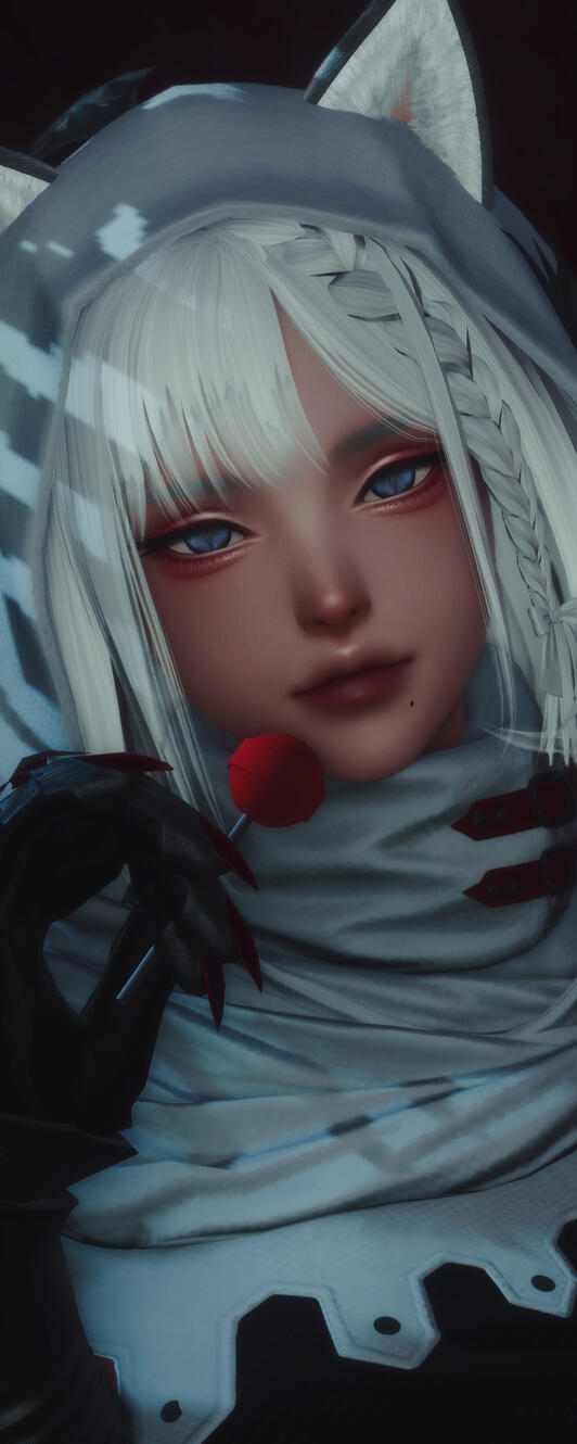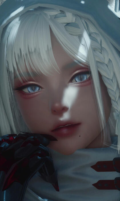 pale white curls that are sun-limned, windswept and held back in a messy ponytail. an ever-present grin, red-lipped and bright, with dimples that touch at cheeks. heavy lashes, red markings lining the inner and outer corners of her eyes; a nose that is prone to scrunching and graceful features.eyes that often hold warmth— eyes the colour of the summer-bright sky, eyes the colour of the dreadwyrm’s aether sparking at fingertips— set ‘neath pale brows.soft & pointed ears, decorated with gold filigree & delicate chains, coloured that same bone-white and pale pink. jewels that glitter ‘neath the sunlight, nestled in her hair and pierced through the base of her ears. often seen with a linkpearl.a strange, shimmering tattoo inked across the upper parts of her shoulders & chest, delicate markings trailing down the curve of waist & hips.